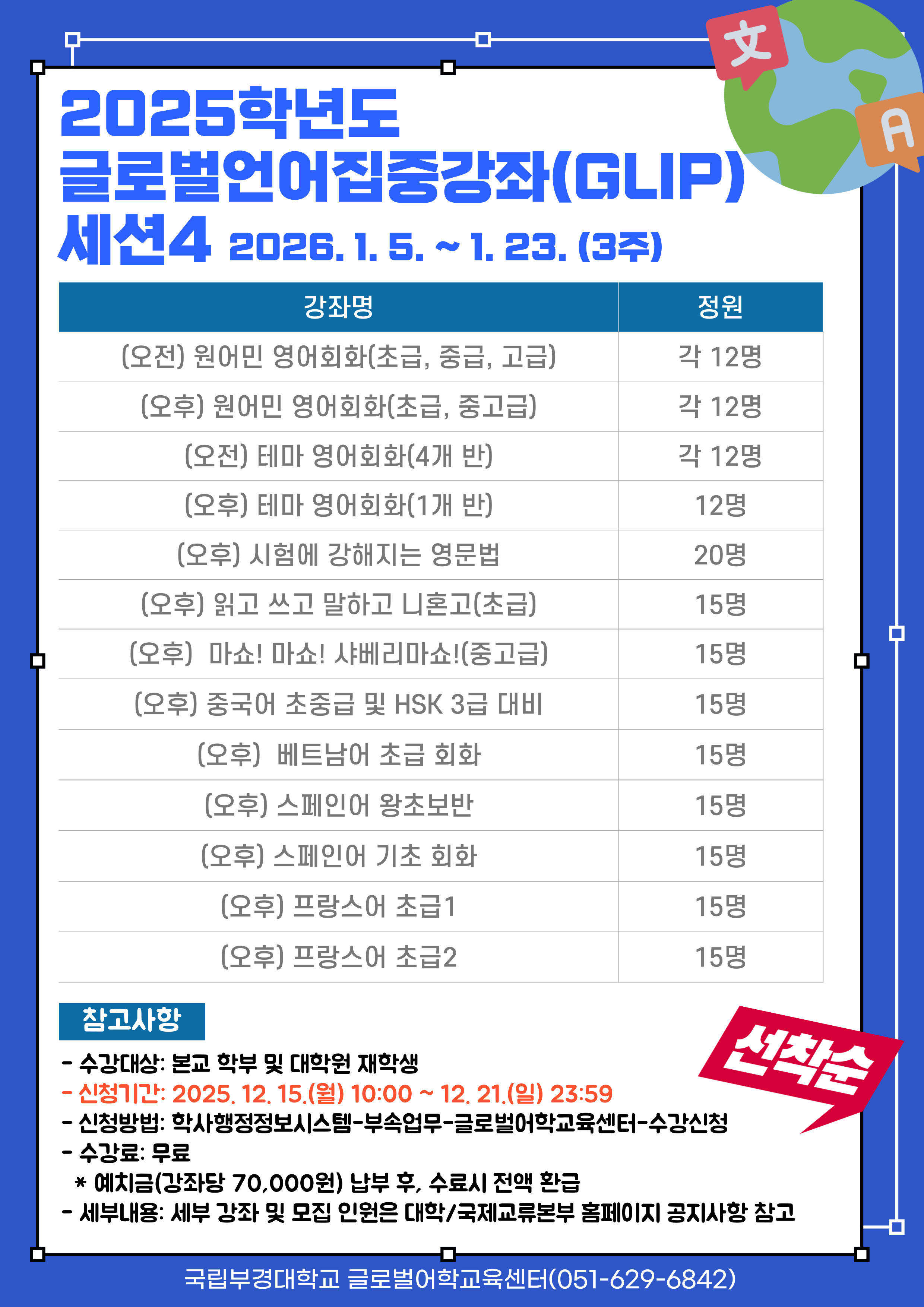 글로벌어학교육센터에서 운영하는 <2025학년도 글로벌 언어집중강좌(GLIP) 세션4>에 학생 여러분의 많은 참여를 바랍니다.