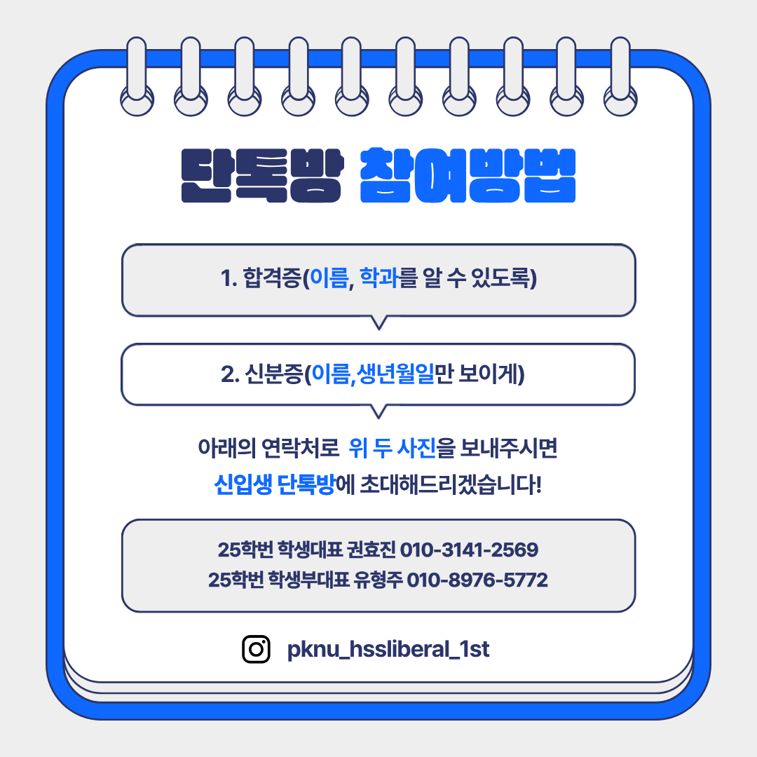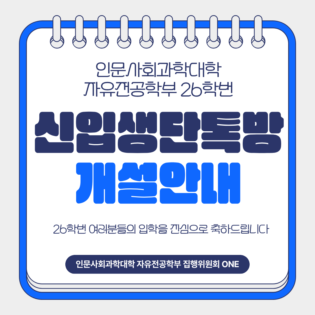 인문사회과학대학 자유전공학부 2026학번 신입생 단톡방은 인문사회과학대학 자유전공학부 집행위원회에서 운영합니다. 아래 공지사항을 읽어주시고 절차를 통하여 단톡방에 가입해 주시면 감사하겠습니다.
