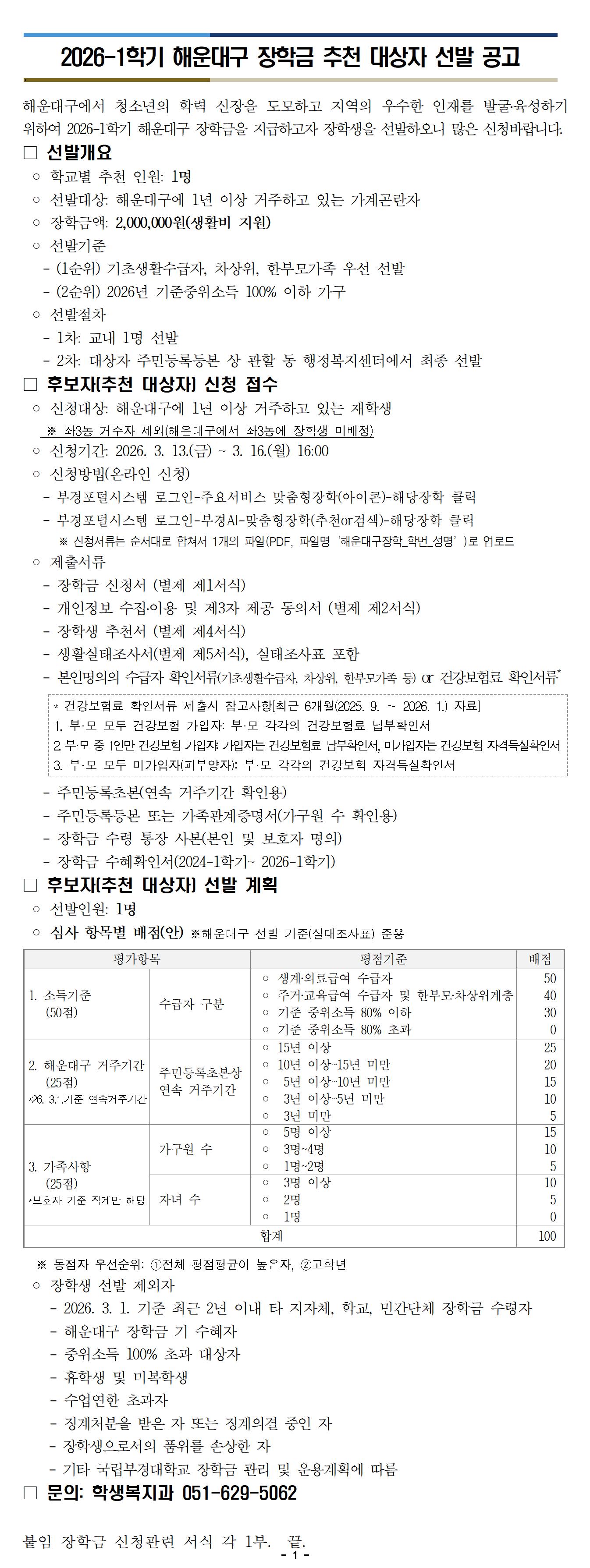 2026-1학기 해운대구 장학금 추천 대상자 선발 공고