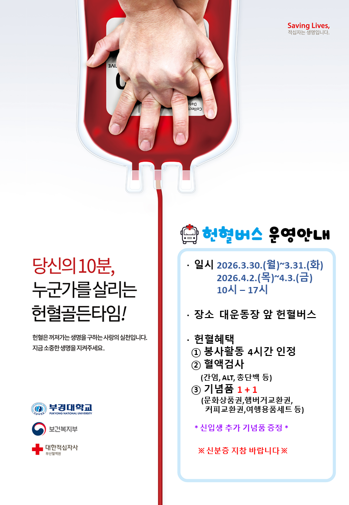 가. 행사일시: 2026. 3. 30.(월) ~ 4. 3.(금) 10:00~17:30 ※2026. 4.1.(수) 제외 나. 행사장소: 대운동장 인근 헌혈버스(신분증 또는 학생증 지참) 다. 헌혈혜택 (봉사시간) 헌혈 1회당 4시간 (혈액검사) 혈액형, 간염, 간기능, 총단백 검사 등 (지 급 품) 헌혈증서, 기념품(신입생 추가 증정), 음료, 다과 등 (기 타) 군입대 가산점