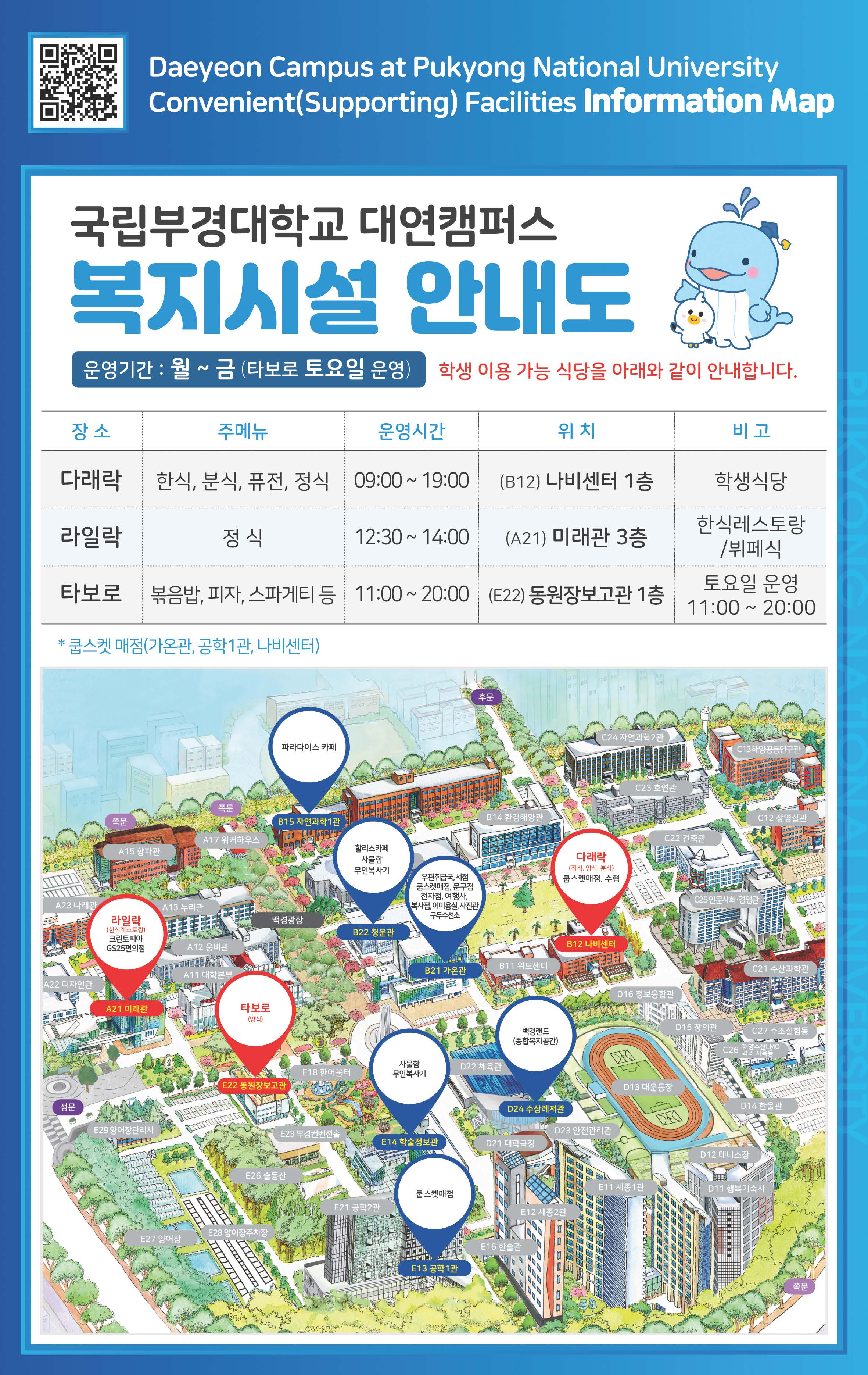 2026학년도 신학기를 맞이하여 국립부경대학교 학내 후생복지시설 안내도 및 목록을 붙임과 같이 제공하오니, 학생 여러분들은 학교 생활에서 적극 활용하시기 바랍니다.