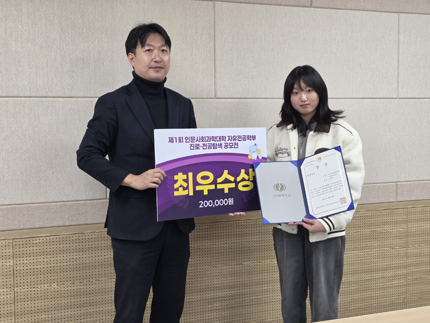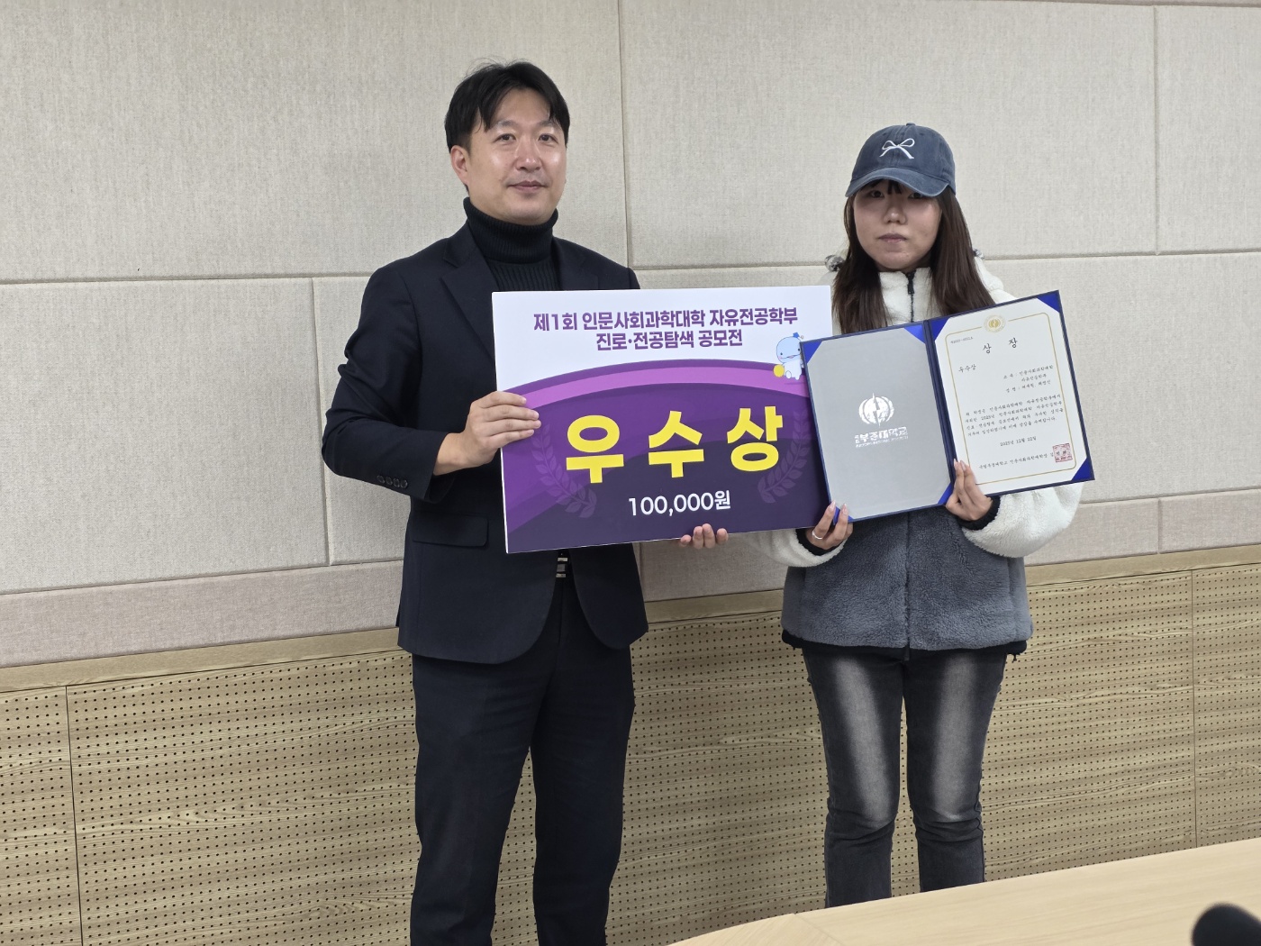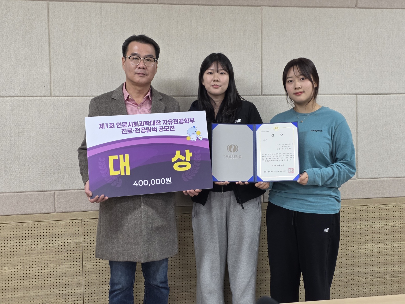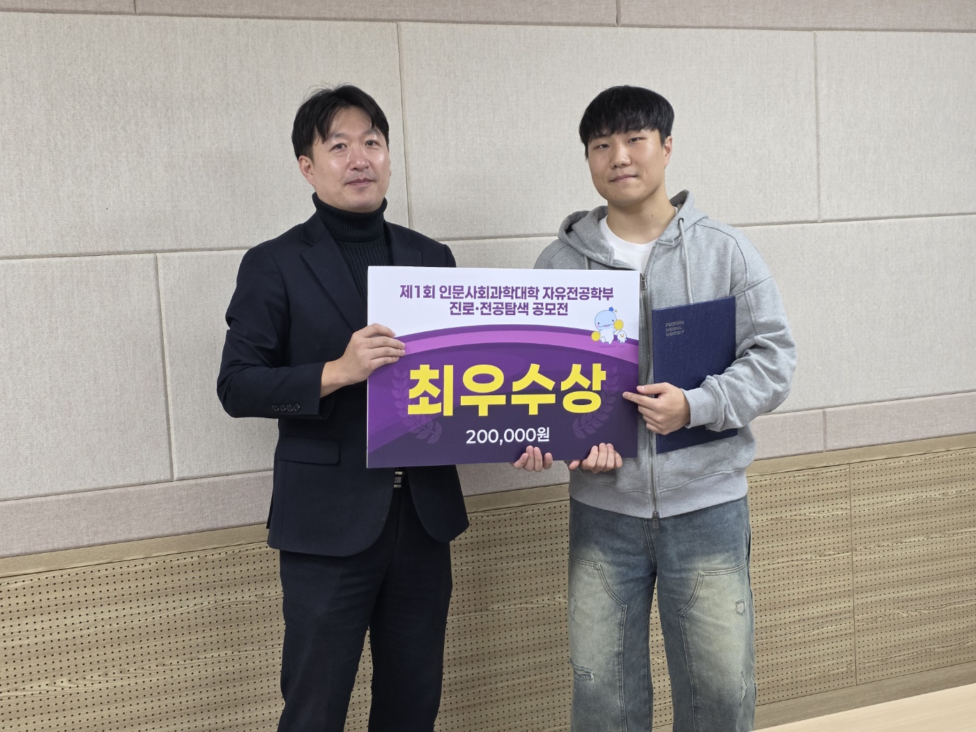 인문사회과학대학 자유전공학부는 학생들의 전공탐색 및 진로설계 과정을 결산하고, 전공 배정 이후의 대학생활과 학업의 의욕을 고취하기 위하여 '인문사회과학대학 자유전공학부 진로·전공탐색 공모전'을 개최하였습니다. 기말고사와 전공배정을 앞두고 학생들이 많이 바쁜 상황이었음에도, 개인을 포함한 총 5개 팀이 공모전에 참여해 주었으며 인문사회과학대학상장 대상 1팀, 최우수상 2팀, 우수상 2팀의 시상이 이뤄졌습니다. 첫 시행에 따른 각종 시행착오에도 불구하고 공모전에 성실히 참여해 준 참가자 학생 여러분께 다시 한번 감사 말씀을 드리며 2026년에는 더욱 충실하고 행정적으로도 더욱 개선된 공모전 운영이 이뤄질 수 있도록 하겠습니다.